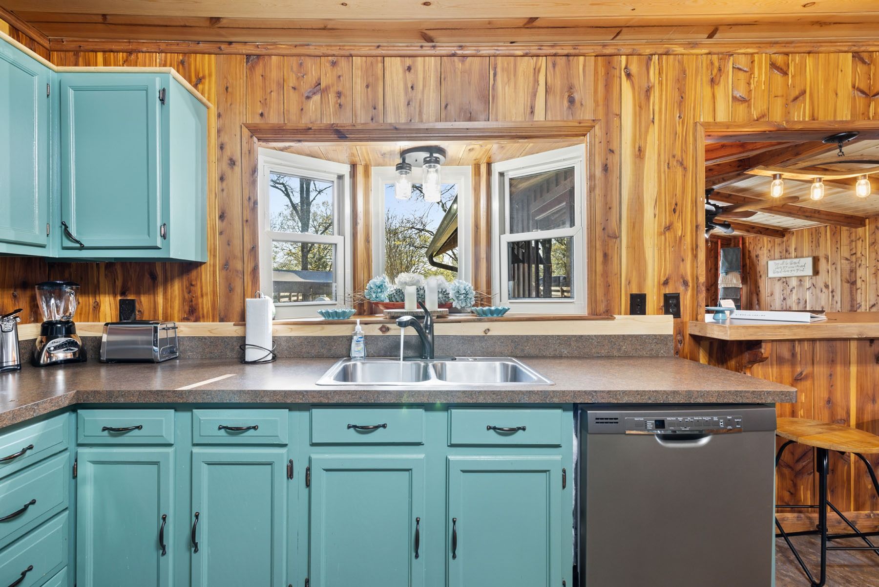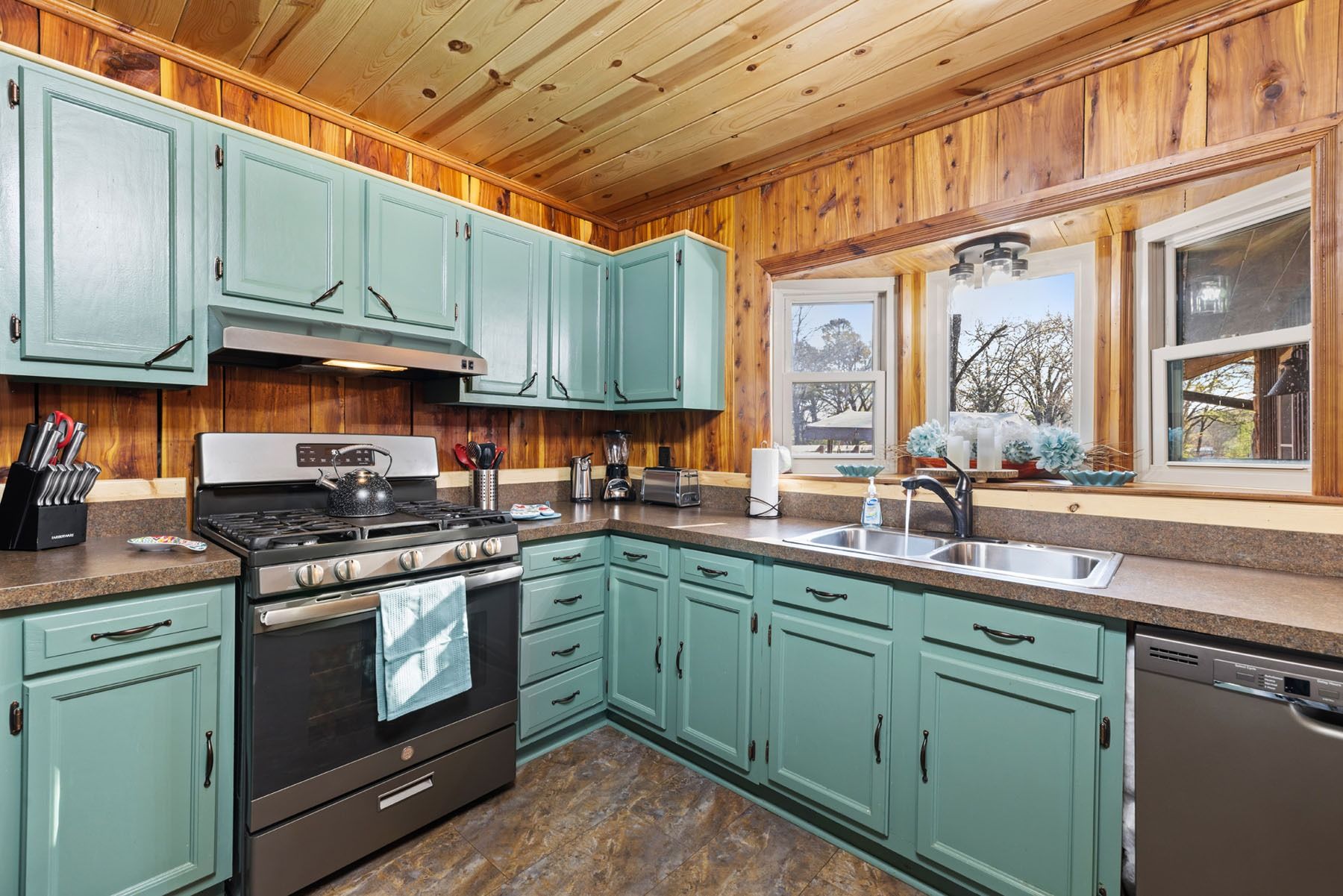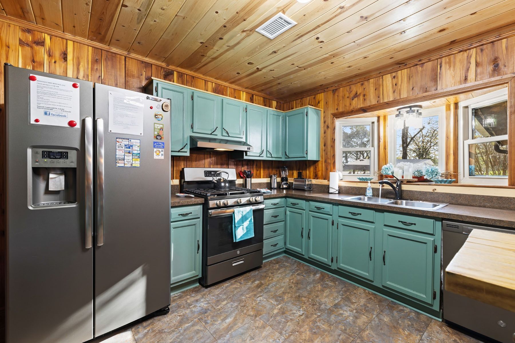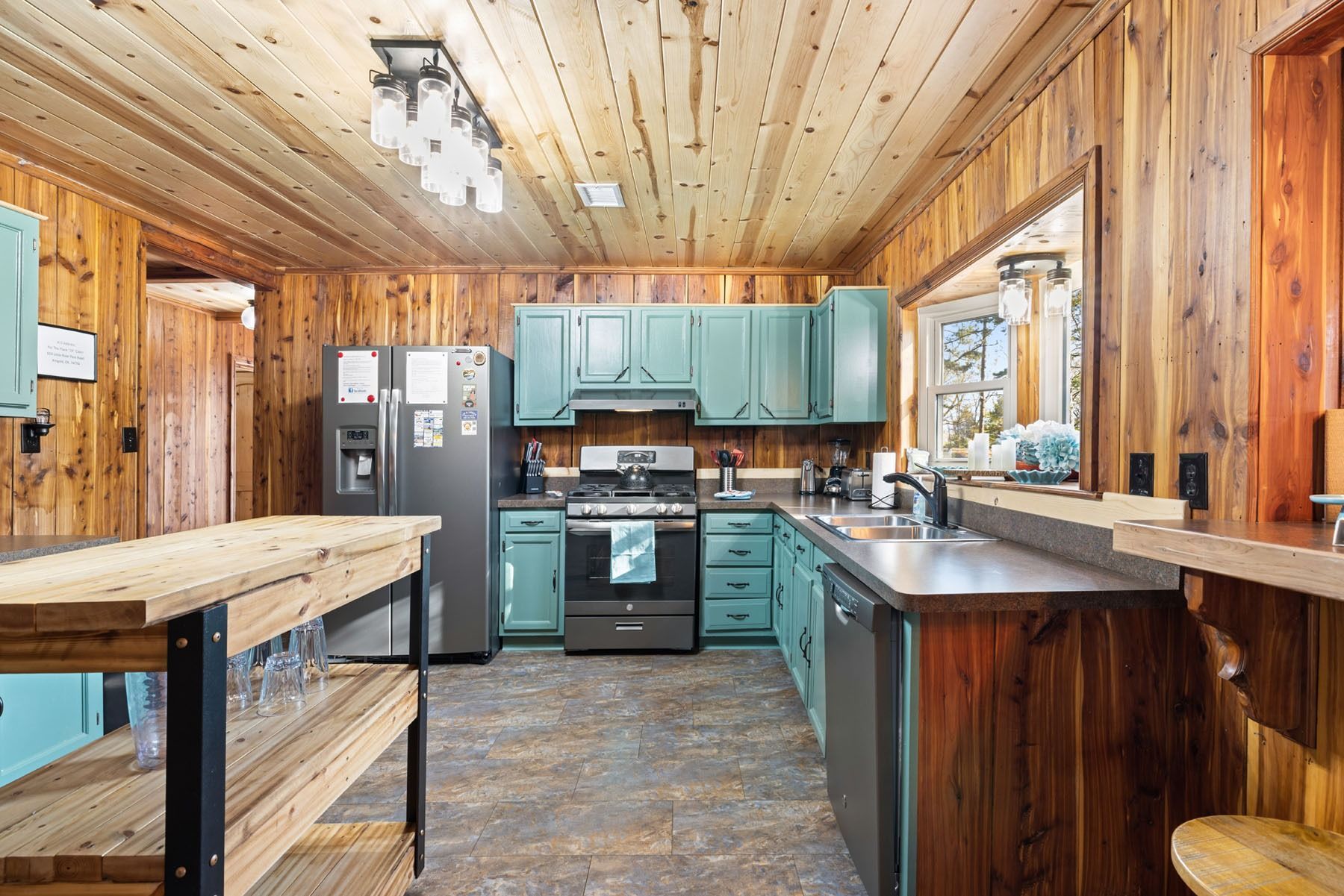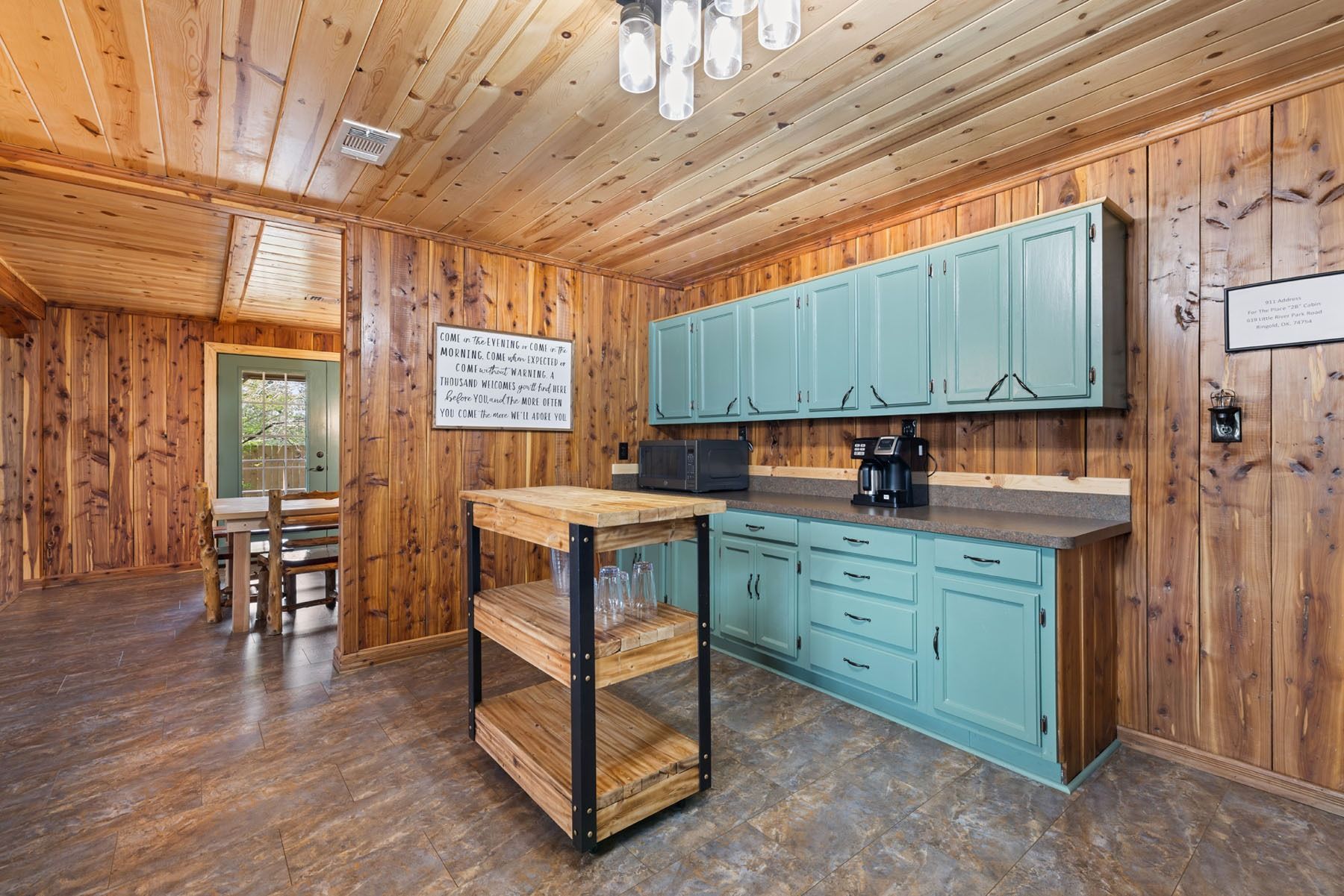 Gas Cook Stove - Refrigerator - Ice maker - Microwave - Dishwasher - Regular drip coffee maker - Blender - Mixer - Crock Pot - Toaster - Cookware - Silverware - Glassware - Utensils - Dishes - Baking pans - Bowls - Island with 2 bar stools - Table/Chairs - French doors leading to the hot tub on the back deck.